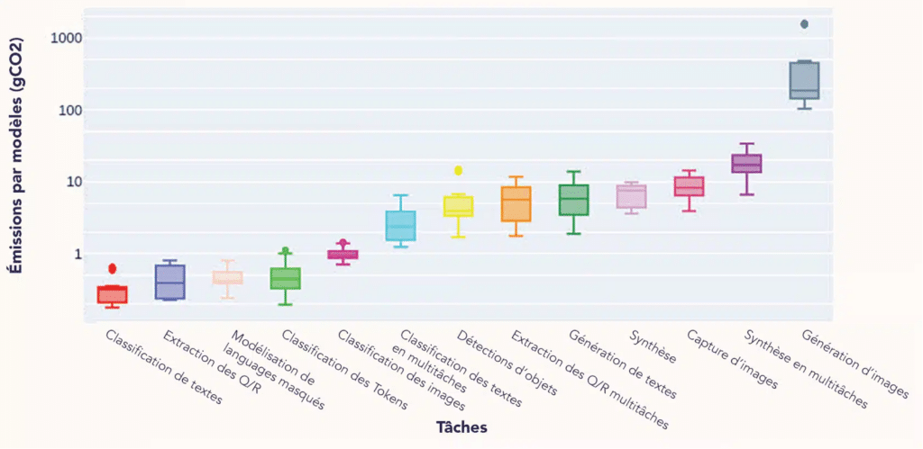 La consommation d'énergie de l'inférence varie considérablement selon la complexité des tâches. Les modèles d'IA générative sont particulièrement gourmands : même pour une requête simple, l'IA utilise toutes les ressources à sa disposition sans optimisation, entraînant un gaspillage d'énergie 13. La génération d'images est notamment 60 fois plus gourmande en énergie que la génération de texte 18.