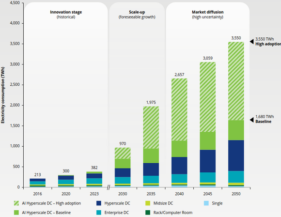 Les centres de données, cryptomonnaies et intelligence artificielle représentent désormais près de 2% de la consommation électrique mondiale en 2022, soit 460 TWh 2. Cette consommation pourrait exploser pour atteindre entre 160 et 590 TWh supplémentaires d'ici 2026, équivalant à la consommation de la Suède ou de l'Allemagne 2. En Europe, la demande électrique pour l'IA est estimée à 35 gigawatts, nécessitant l'équivalent de 35 réacteurs nucléaires pour répondre à cette demande 1.