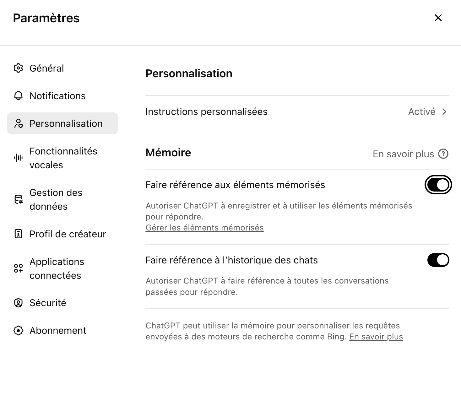 Pour le désactiver, rendez-vous dans Paramètres > Personnalisation > Mémoire. Décochez ensuite les options “Faire référence aux éléments mémorisés” et “Faire référence à l’historique des chats”.